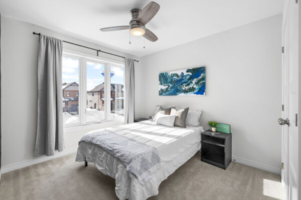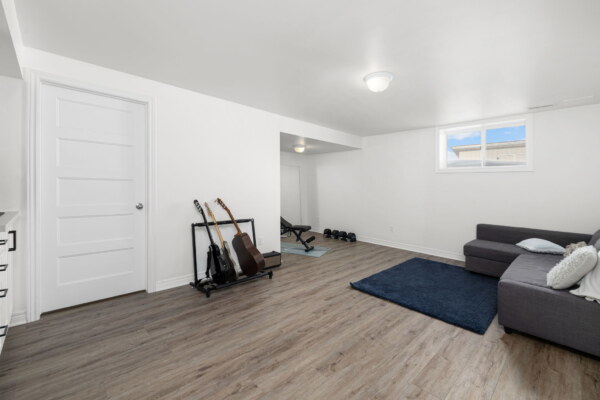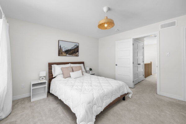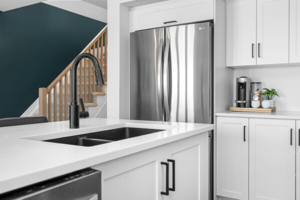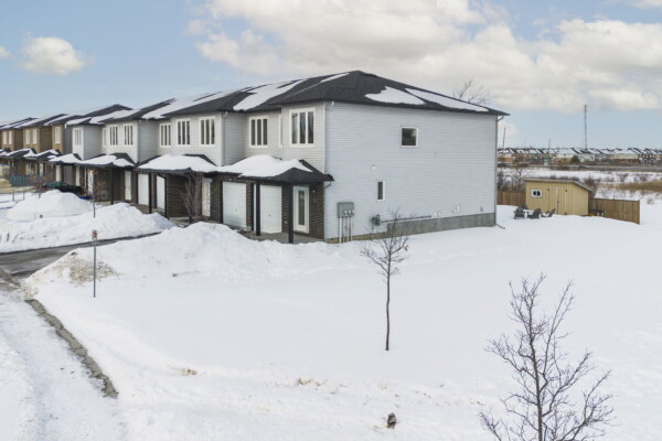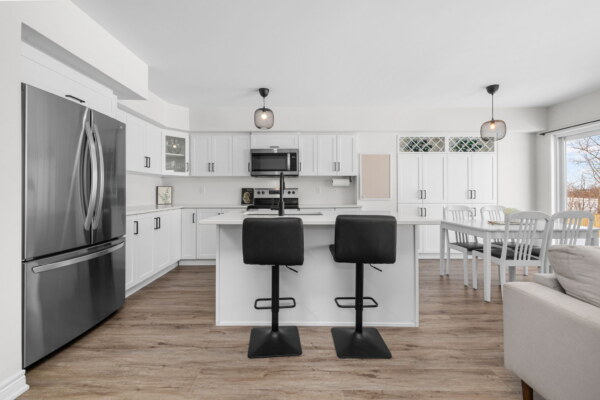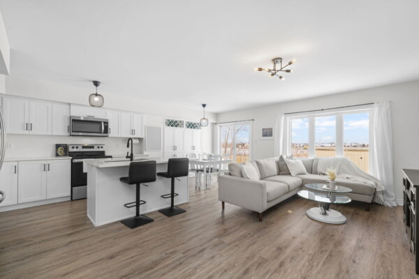 Welcome to this beautifully maintained 2022-built end-unit townhome offering exceptional privacy with no rear neighbours and no direct side neighbour. With 3 bedrooms, 2.5 bathrooms, and a finished basement, this home blends modern style with everyday functionality. The thoughtfully designed main level features an open-concept layout ideal for both entertaining and family living. The classic white kitchen is complemented by quartz countertops, black hardware, a spacious island with breakfast bar, and custom built-in pantry cabinetry for added storage and organization. Luxury vinyl flooring runs throughout the main level and continues into the finished basement for a cohesive and contemporary feel. Upstairs, the primary suite offers a relaxing retreat complete with a beautifully designed ensuite featuring a double sink vanity and a custom built-in walk-in closet. Two additional bedrooms, a full main bathroom, and convenient second-floor laundry complete the upper level. The finished basement expands your living space with a comfortable family room and a newly added wet bar—perfect for hosting guests or creating the ultimate movie-night setup. Located within walking distance to shops and restaurants, this home offers the perfect balance of privacy, style, and convenience—simply move in and enjoy.Priced at: $559,900